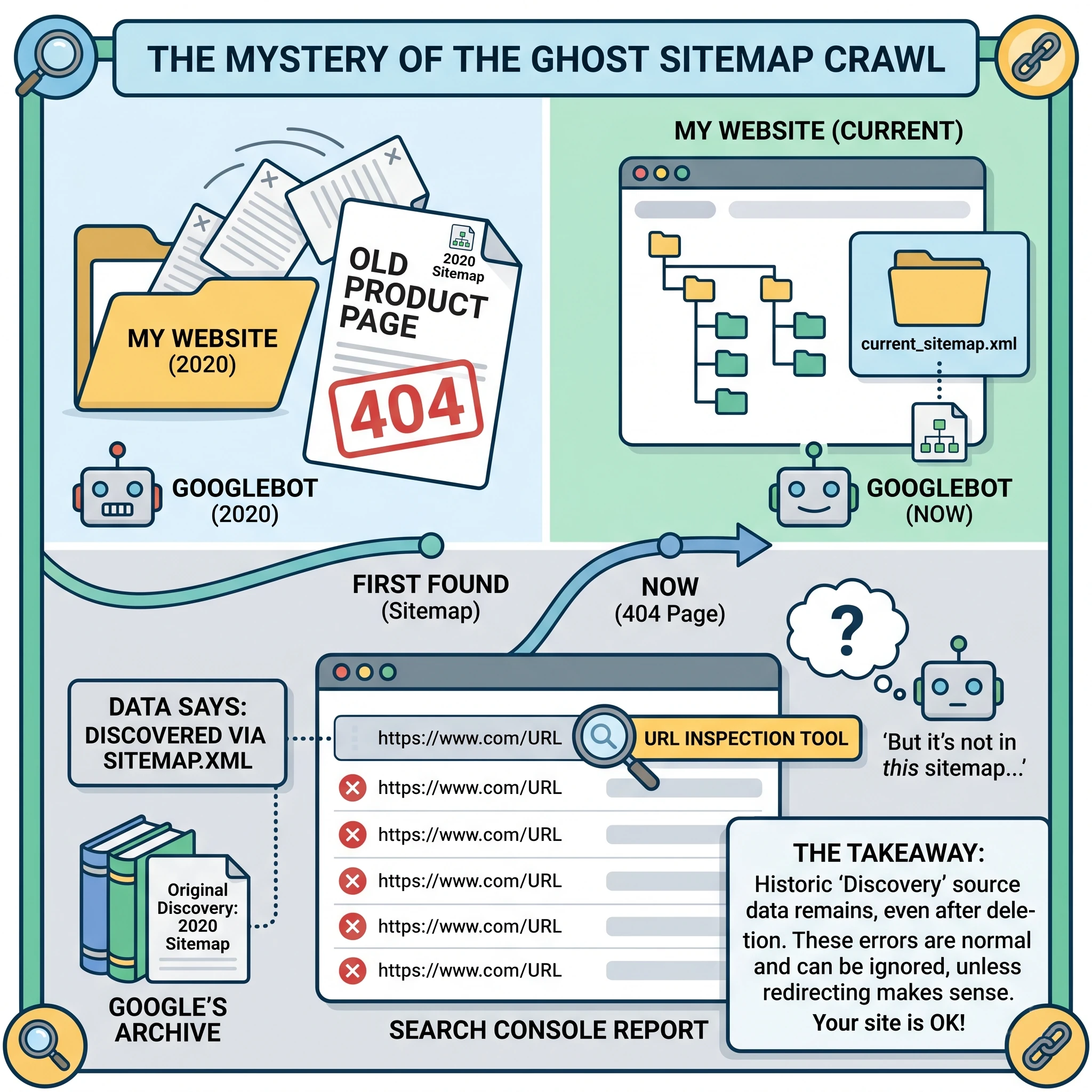 Key Takeaway: If Google Search Console reports 404 errors for pages “discovered via sitemap.xml” that are no longer in your sitemap, it is not a technical bug or a sitemap error. Google simply retains the original discovery source in its records indefinitely. There is no permanent “fix” to stop these crawls, but they do not harm your site’s ranking or performance. You can safely ignore them or use a 301 redirect to recapture any residual traffic.
